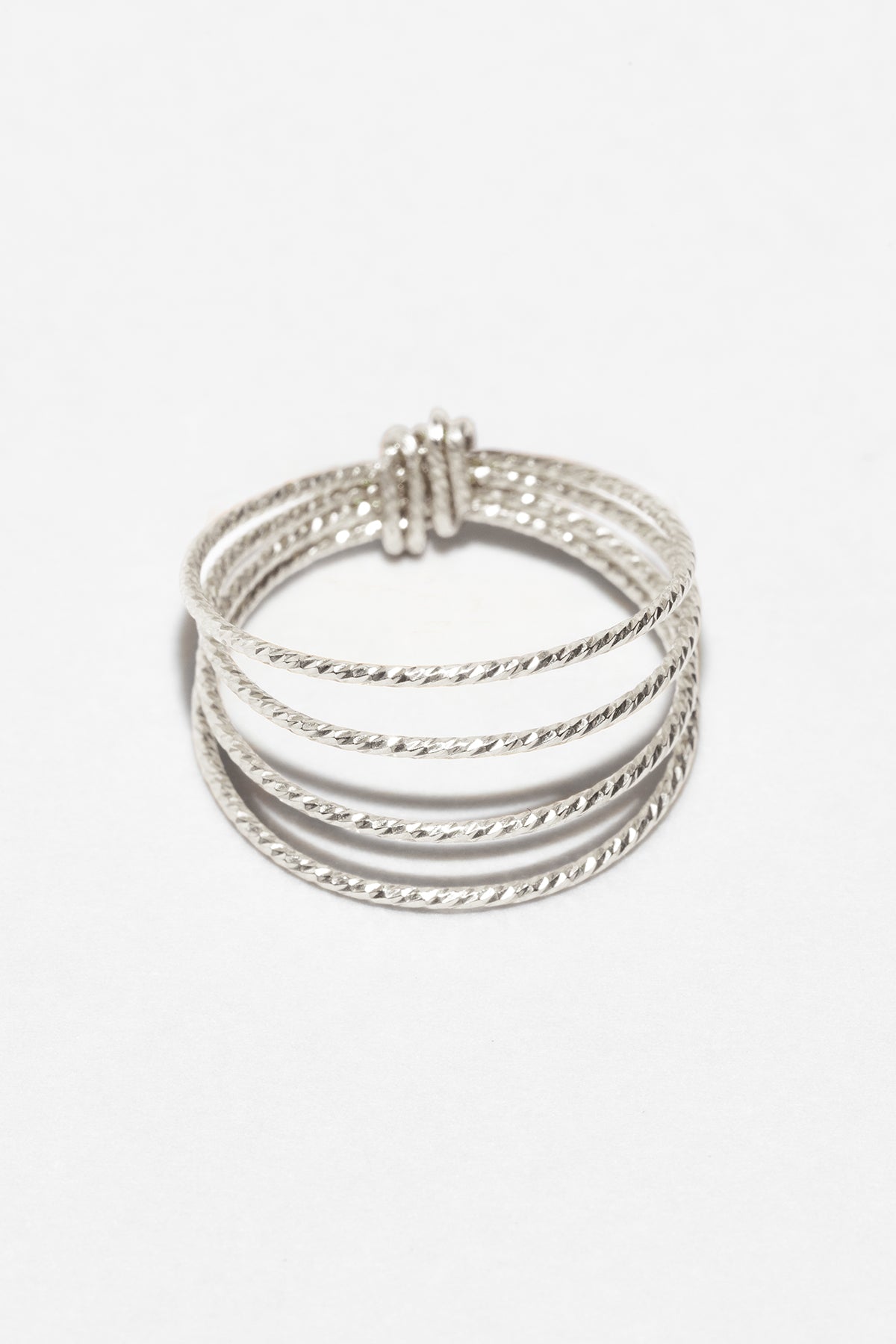 Cette bague multi-rangs habille le doigt en filigrane d'une précieuse esquisse. Un fil d'argent texturé enlace le doigt de cinq tours avant de se finir en un nœud signature yay.