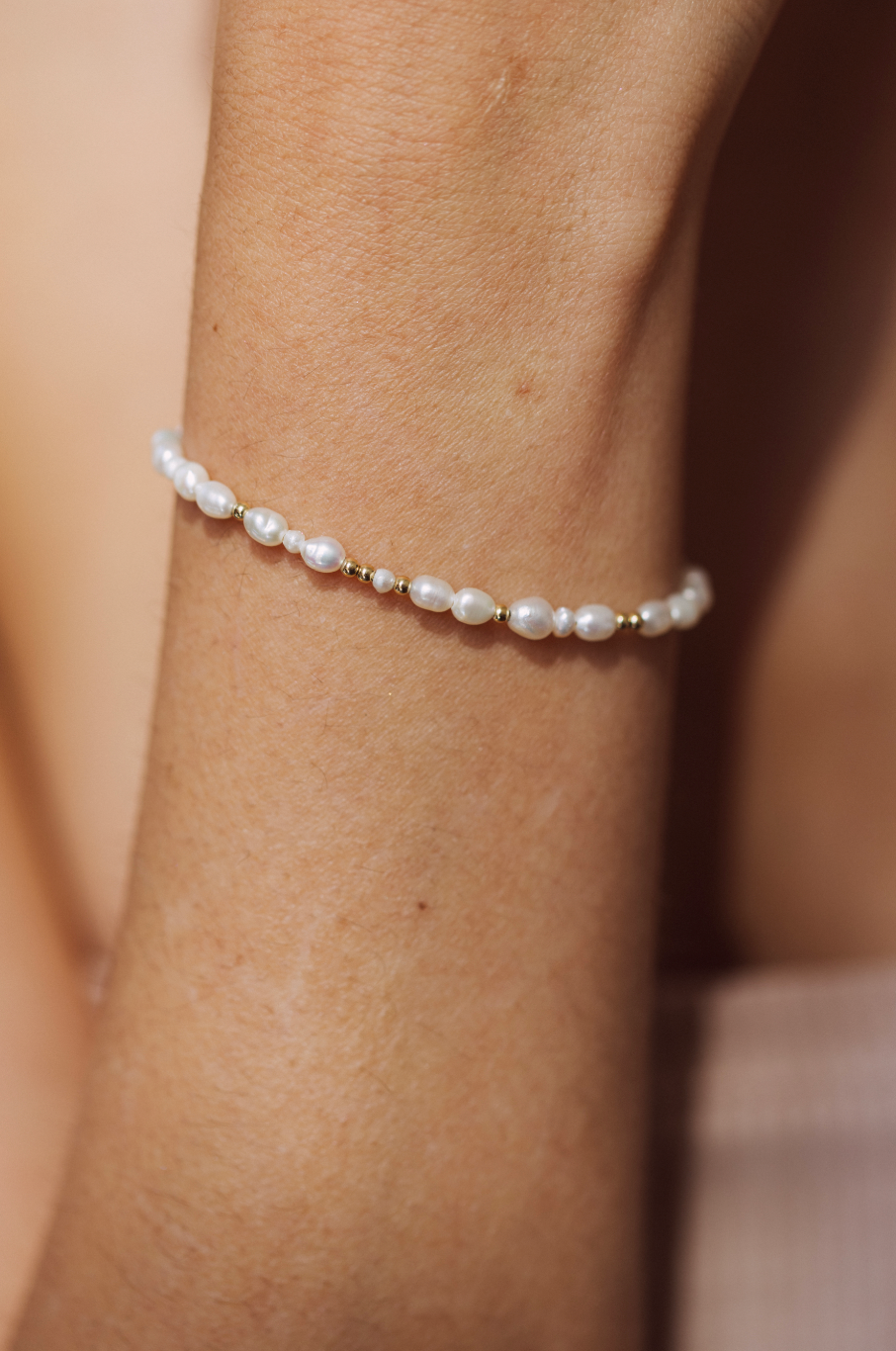 Pour donner un nouveau souffle au traditionnel bijou en perles, nous avons choisi d'associer des perles de culture aux formes variées – grain de riz et baroques – et de petites perles dorées. Enfilées de manière aléatoire, elles créent un rythme délicat et une allure précieuse, tout en subtilité.
