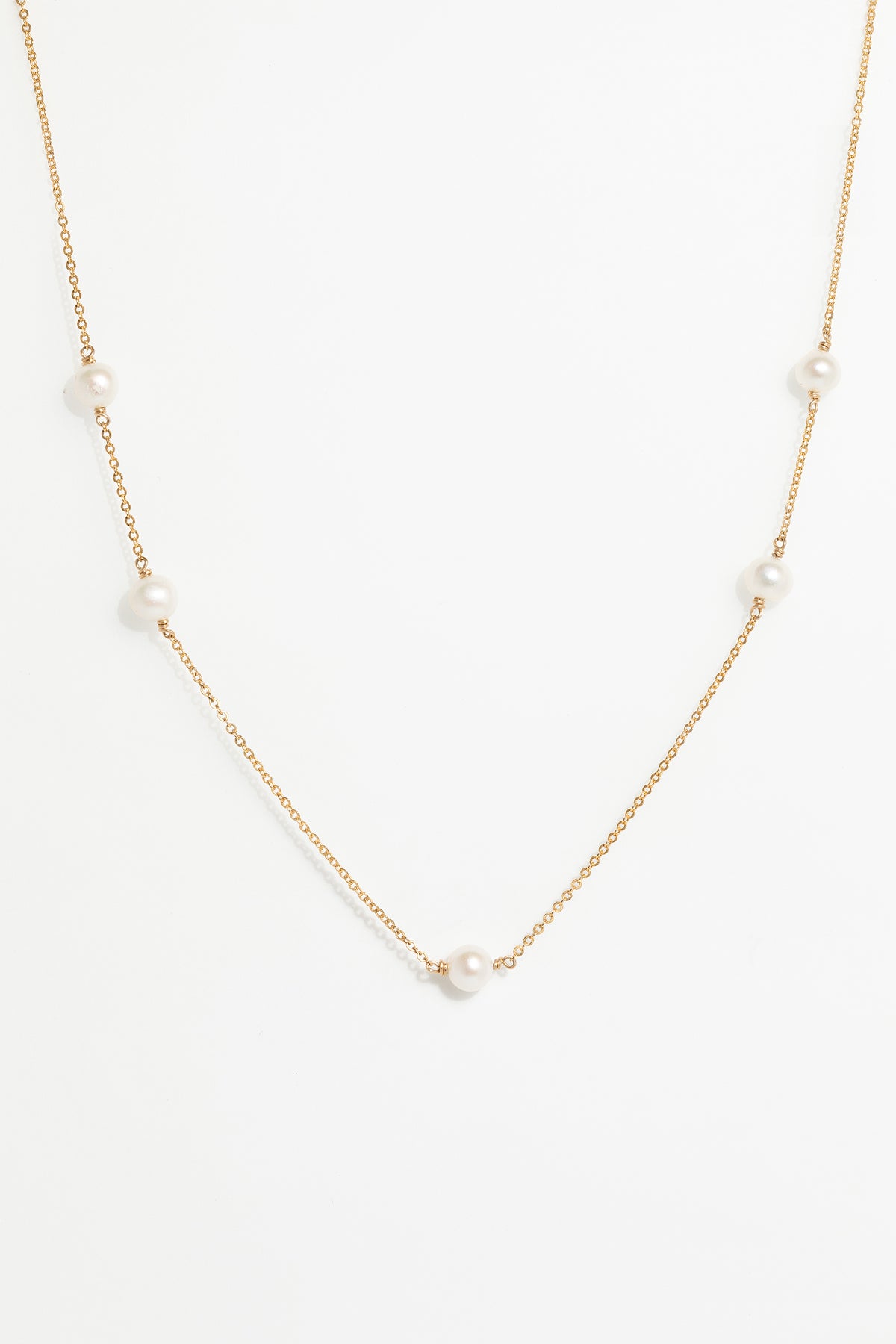 Sa fine chaîne dorée, ponctuée de perles de culture lumineuses, crée un jeu de douceur et de simplicité.