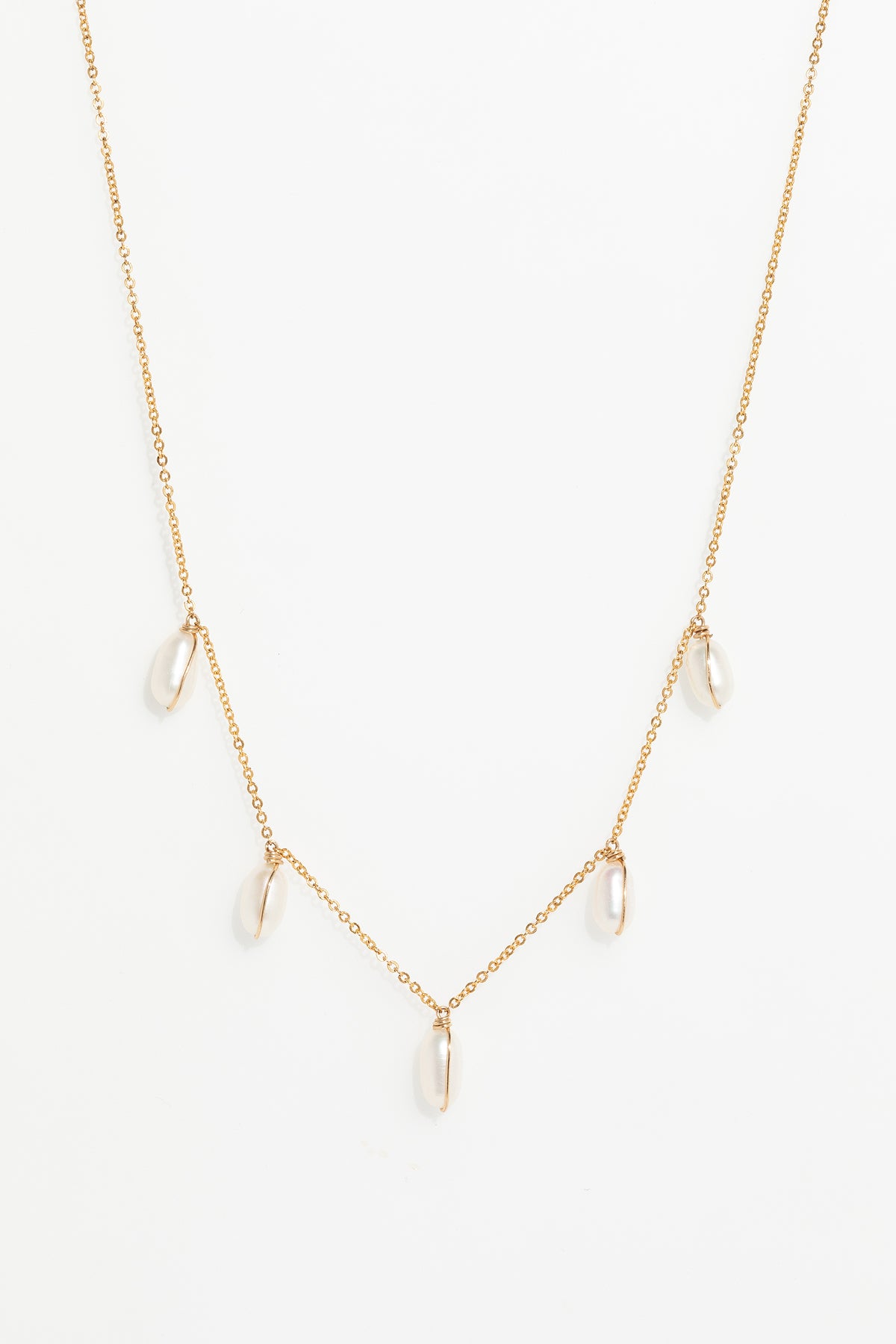Le collier Faraya est composé de cinq pampilles en perles de culture ovales retenues par une boucle de fil or, le tout monté sur une chaîne fine en or laminé 585/1000.
