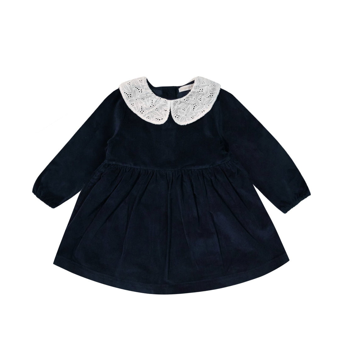 Cette robe délicate séduit par son velours profond et son col en dentelle raffinée, apportant une touche de charme intemporel.
