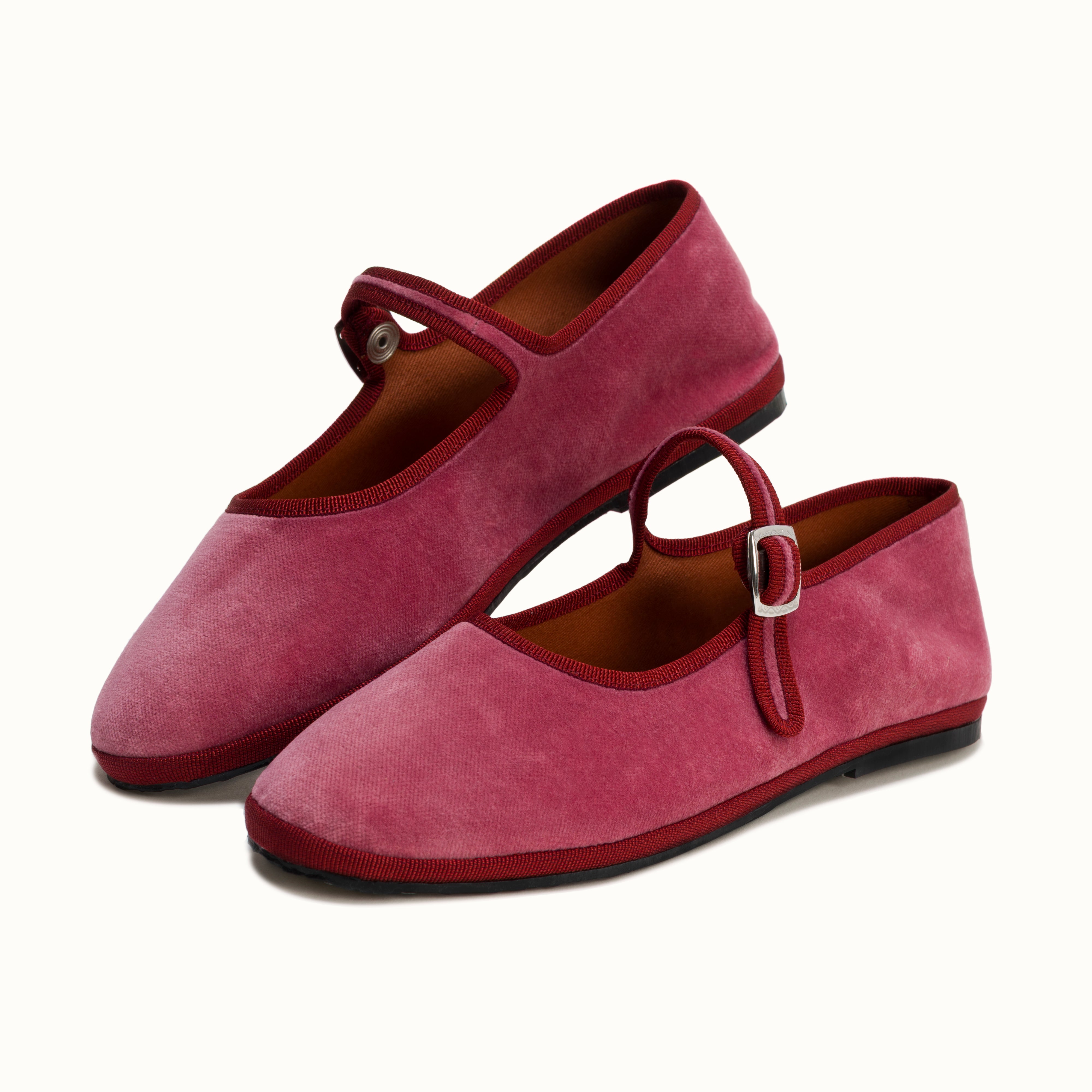 Mary-Jane en velours rose framboise et rebords en gros grain bordeaux.