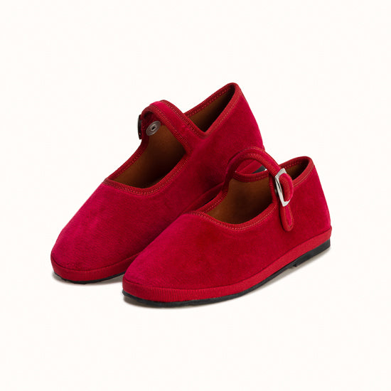 Mary-Jane en velours rouge cerise et rebords en gros grain ton sur ton.