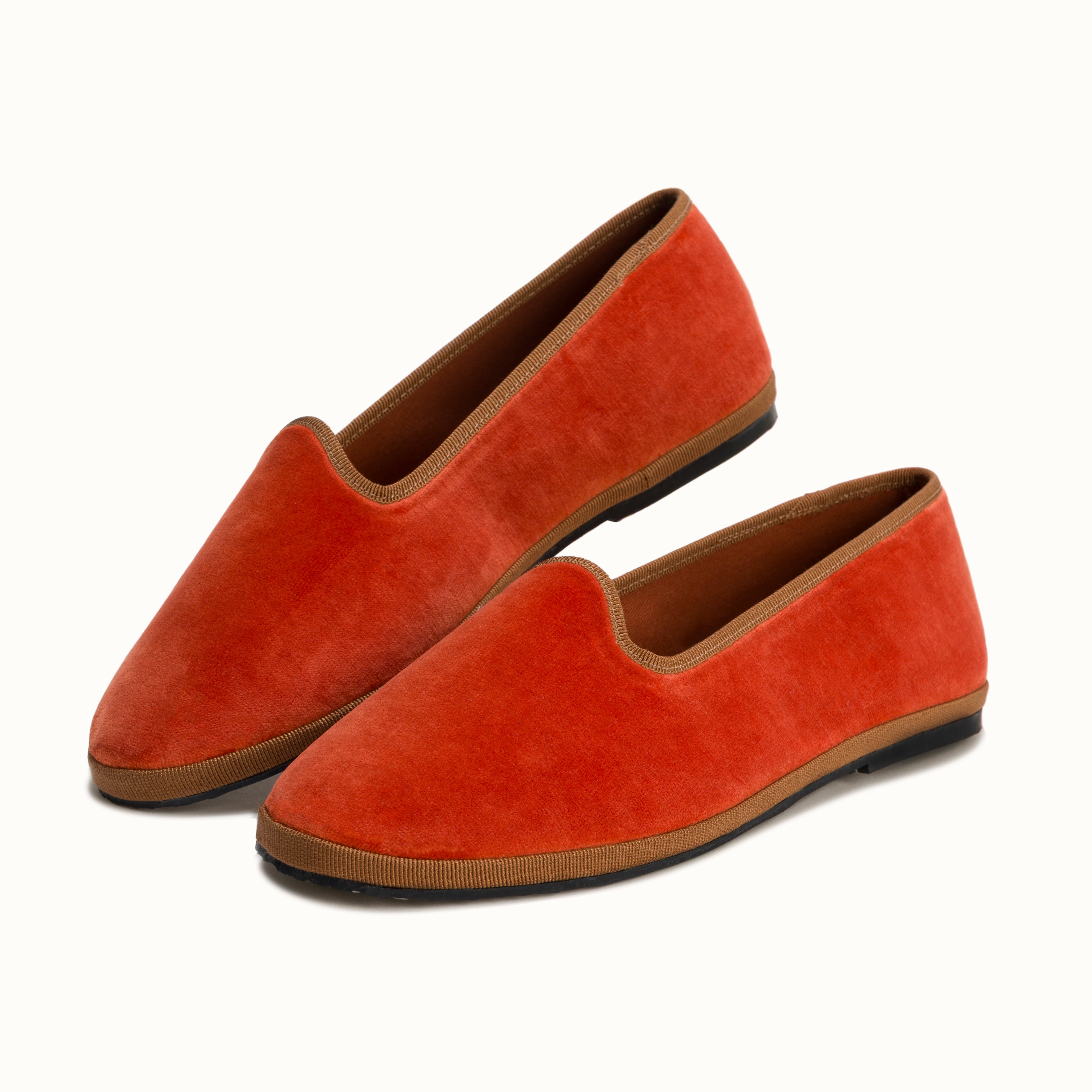 Friulane en velours orange brique et rebords en gros grain camel.